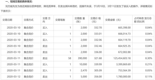 2019年9月10日英科转债上市当日,刘方毅就减持发行总量10%的可转债,这也是可转债市场的常规操作;9月25日再次公告减持同样比例;2020年4月7日,英科医疗公告,因为所谓的"误操作",刘方毅于3月份实质减持大量的可转债,并发布不减持可转债的承诺。但此时刘方毅持有可转债544509张,占比已从发行时的41.54%下降到11.59%。