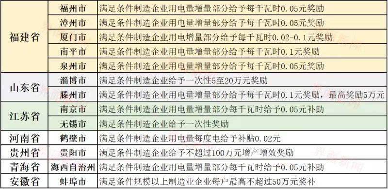 福建泉州市对一季度工业总产值不低于5000万元且同比增长10%及以上的规模以上制造业企业,按企业一季度用电增量给予每千瓦时0.05元奖励。