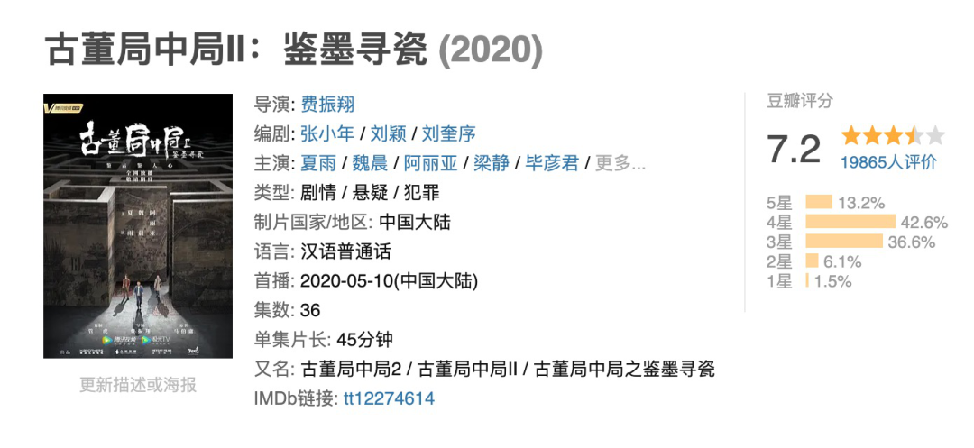 然而这些IP剧中大部分作品最终都未见下文。只有《古董局中局》实现了剧集的系列化,在2018年和2020年先后推出了两部,在豆瓣上评分分别为6.8和7.2。