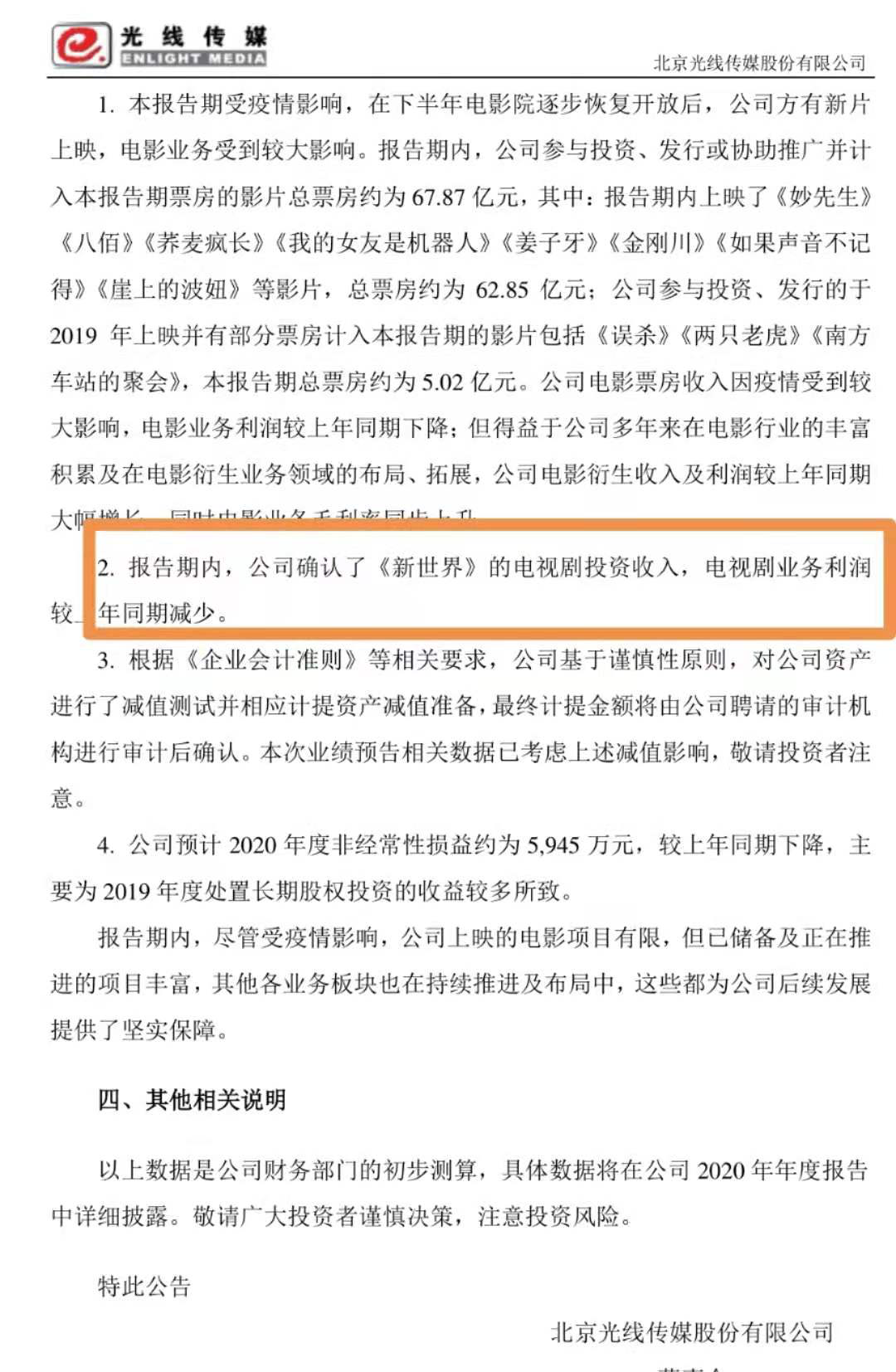 根据光线1月28日刚发布的业绩预告,2020年其确认电视剧收入的仅有去年年初的《新世界》。去年4月官宣的14部剧,看来还需要更长的周期才能兑现。