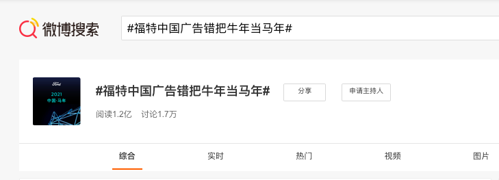#福特中国广告错把牛年当马年#话题在微博的阅读量超过1.2亿,1.7万讨论量。
