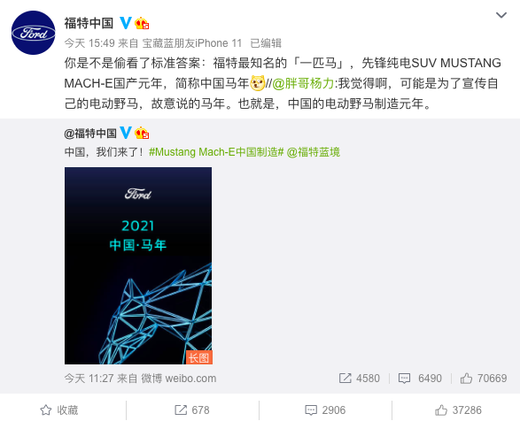 @福特中国 很快去主动地收割了这波流量,给出了自己的谜底。原来,这个“马年“的意思是“中国的电动野马制造元年”。其实,在第一张海报里,“Mustang”就是福特经典的野马品牌的名称。
