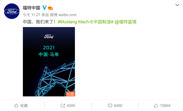 今天中午11点27分,在社交媒体的活跃时间点,@福特中国 微博发布了一条内容: