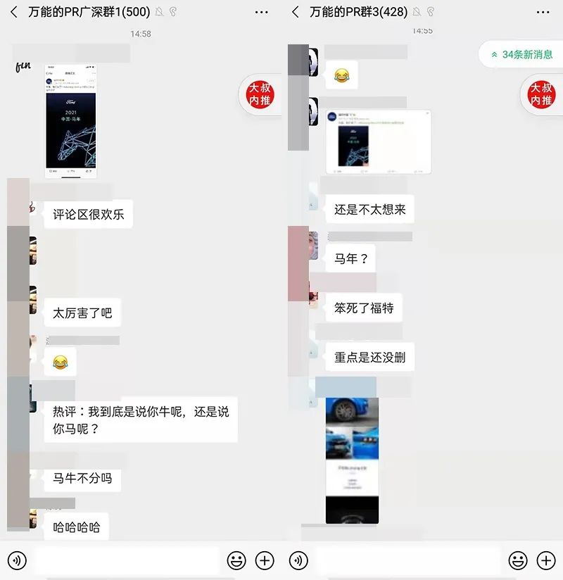大叔看到这个内容,应该是在当天下午2点左右,大叔的多个微信社群里,都有人在发这张图,并配上一句类似的文案:“福特傻叉”。