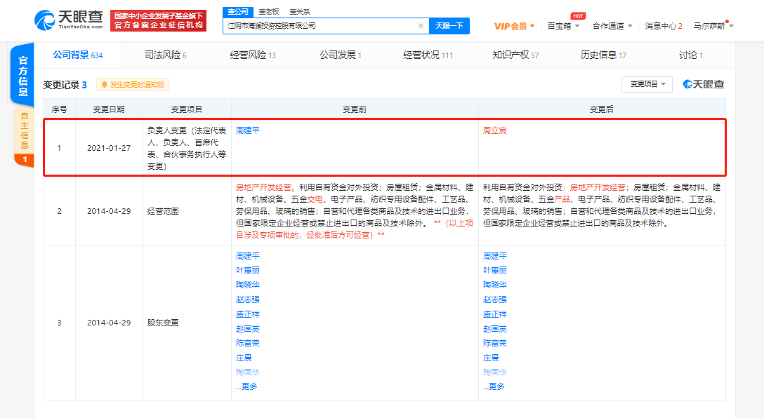 天眼查APP显示,1月29日,海澜之家关联公司江阴市海澜投资控股有限公司发生多项工商变更,原法定代表人周建平退出,由周立宸接任。