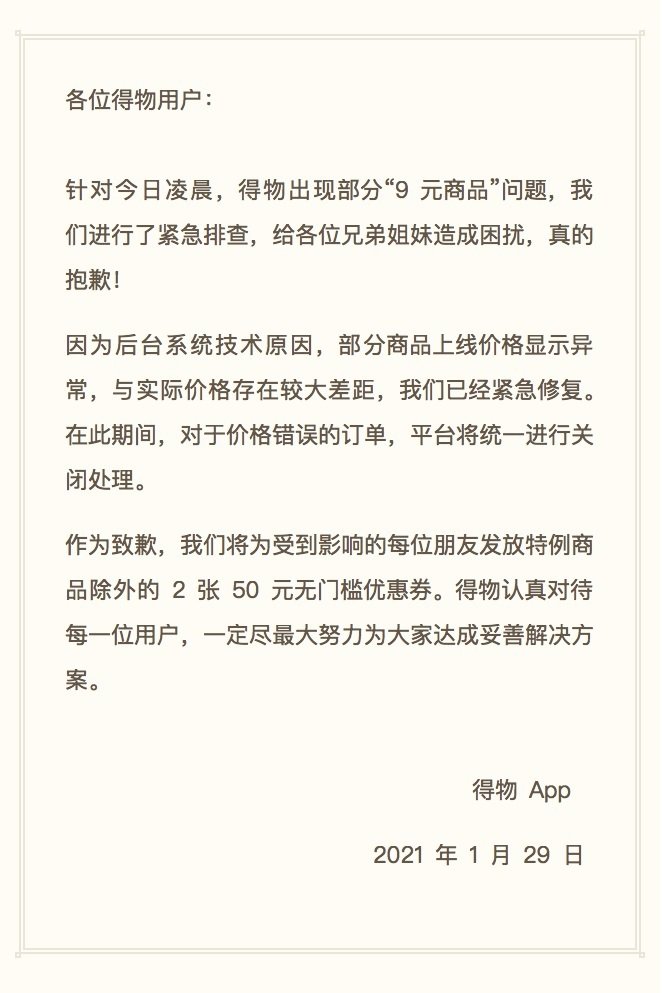 1月29日,得物通过其官方微博发布情况说明,针对得物出现部分“9元商品”问题,公司经过排查发现,因为后台系统技术原因,部分商品上线价格显示异常,与实际价格存在较大差距。