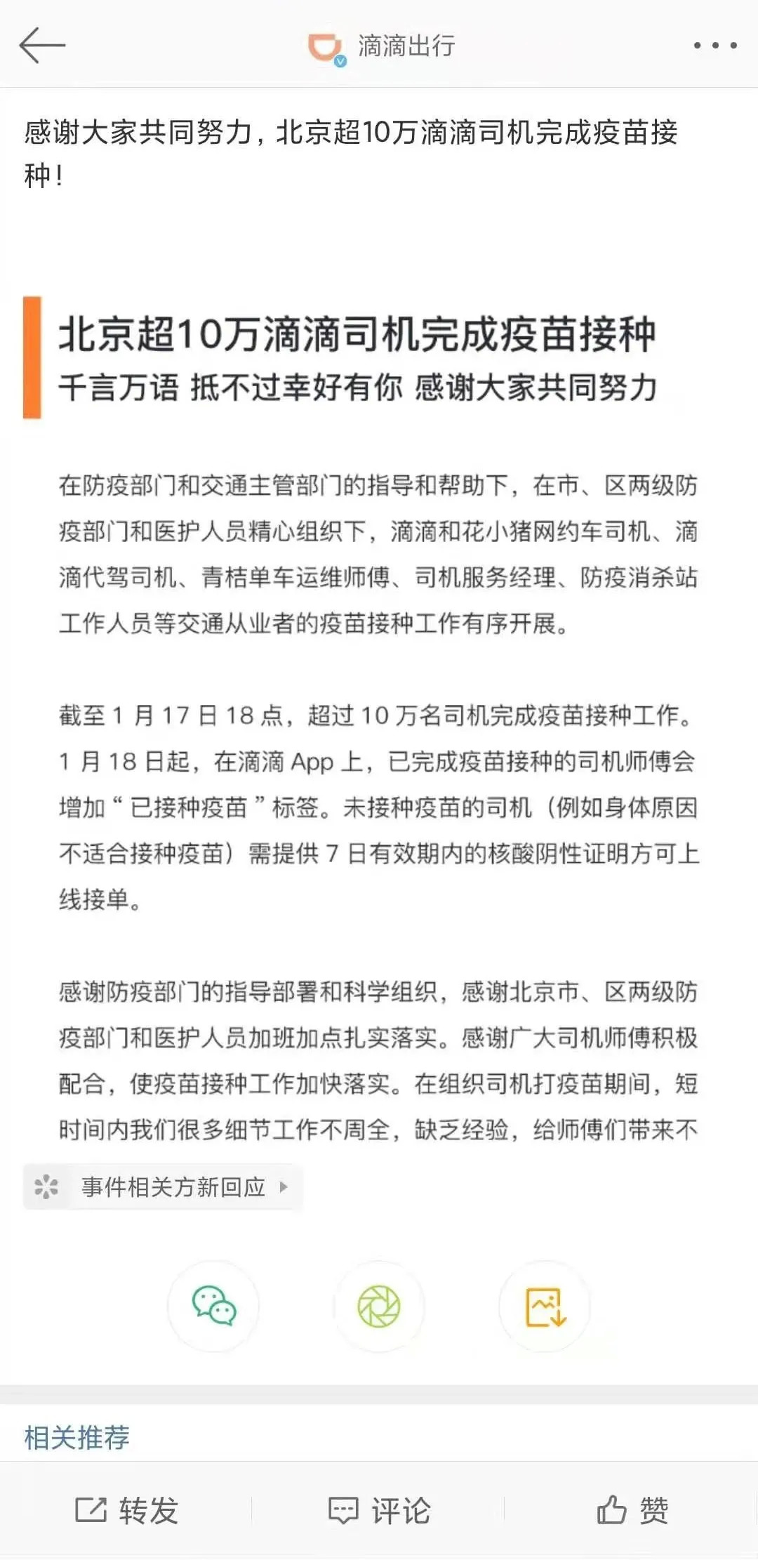 先是在去年底,滴滴出行和花小猪打车宣布,为北京滴滴和花小猪司机免费做核酸检测。再到本月17日,滴滴发布公告称,截至1月17日,超过10万名司机完成疫苗接种工作。