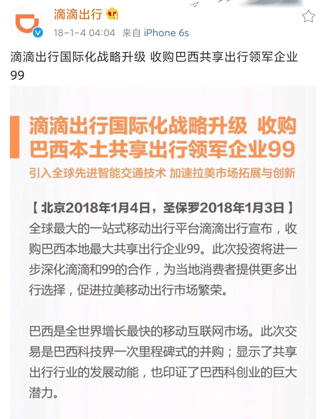 滴滴收购巴西本土打车平台99,图源滴滴出行官微