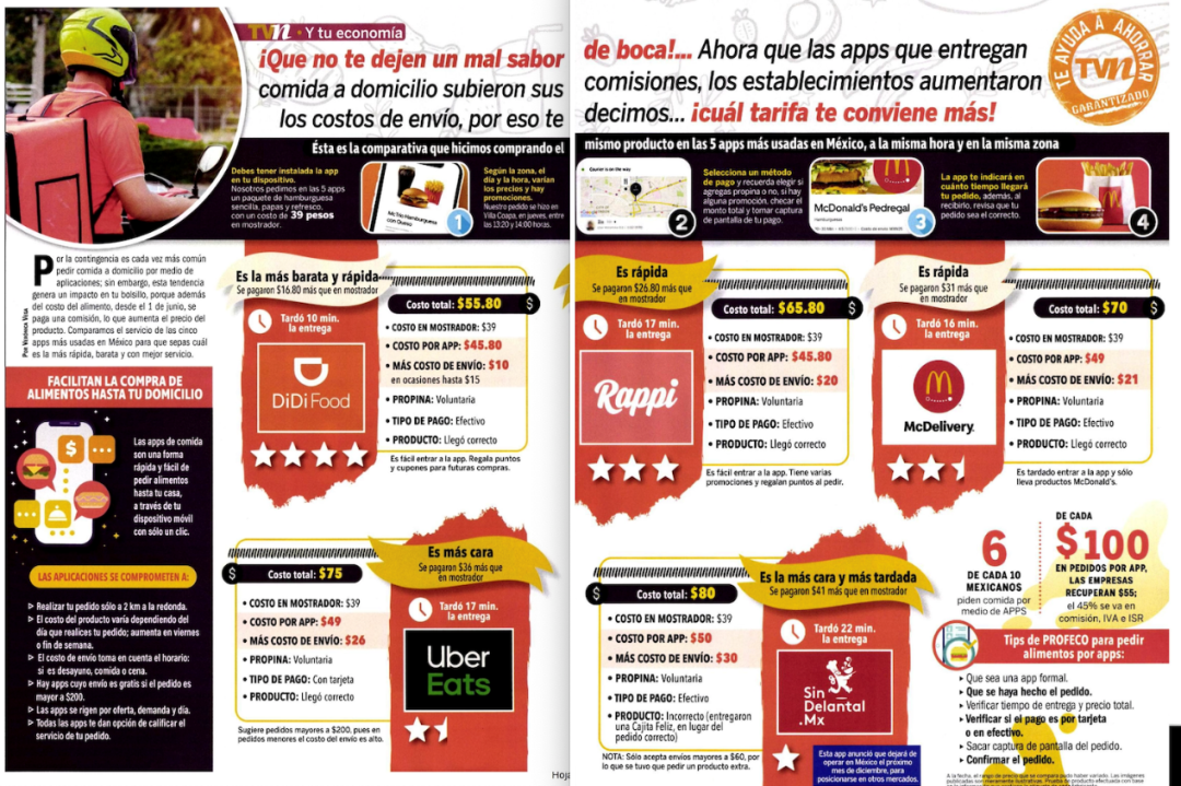 两个月前,墨西哥最受欢迎的杂志之一——《电视小说》杂志(TV Novelas)曾对当地5家外卖品牌的客单价与配送时间进行对比,并将结果刊登在杂志上。