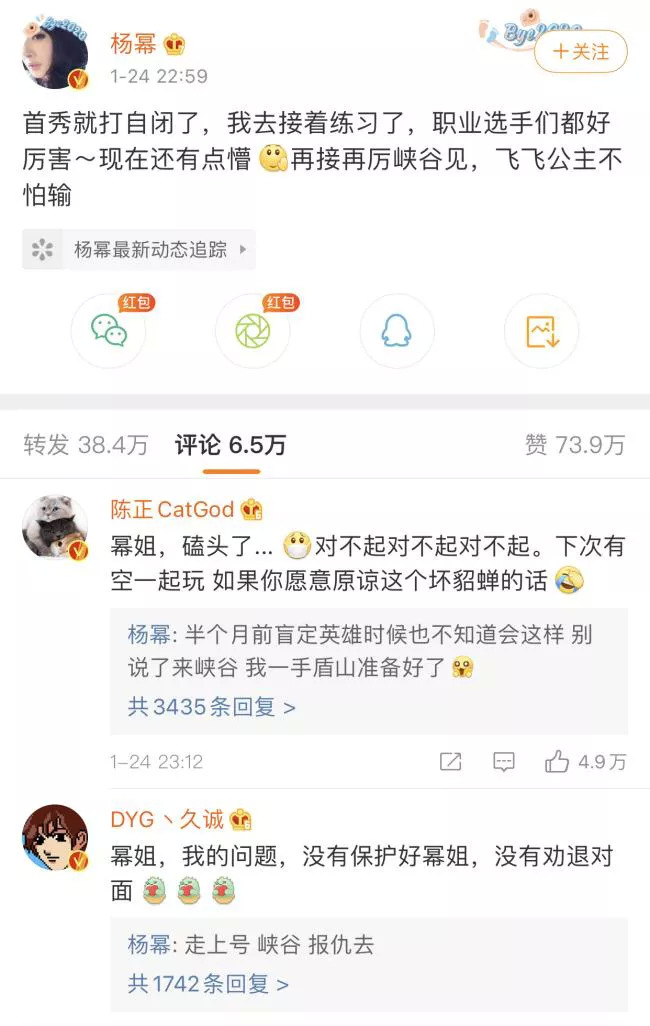 由于在比赛中多次遭到职业选手Cat的击杀,赛后,杨幂发微博称自己“首秀就被打自闭了”,并和Cat在评论区再次“约架”。众多KPL(王者荣耀职业联赛)职业选手和解说也加入话题,纷纷表示“我打廉颇保护你”、“我们峡谷报仇去”。“飞飞公主”是游戏玩家们称呼英雄张飞的梗。