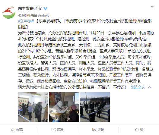 1月30日,据吉林省东丰县互联网信息中心官方微博@东丰发布0437 消息,为严防新冠疫情,充分发挥核酸检测作用,1月29日,东丰县在与梅河口市接壤的4个乡镇21个村开展全员核酸检测。经检测,此次全员核酸检测结果均为阴性。
