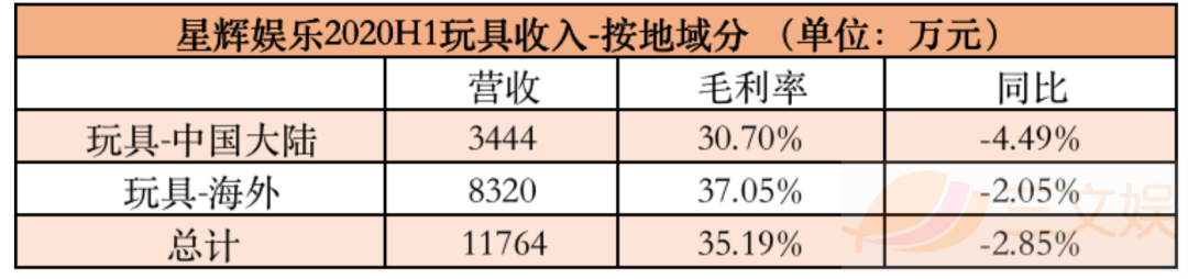 从玩具业务的收入构成看,2020年上半年有3444万元来自中国大陆,来自海外的收入为8320万元。