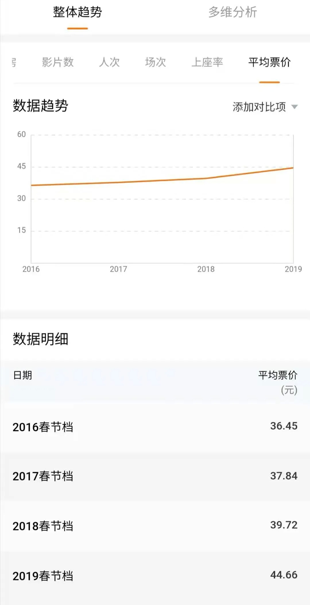 今年影响票房的另一因素在于:增长的票价。2017年到2019年春节档票价,依次为38.06元、39.97元、44. 97元,每年票价都会微微上调。但多位影院负责人都表示,今年春节档票价提升过高,很可能会打击观众的观影热情。
