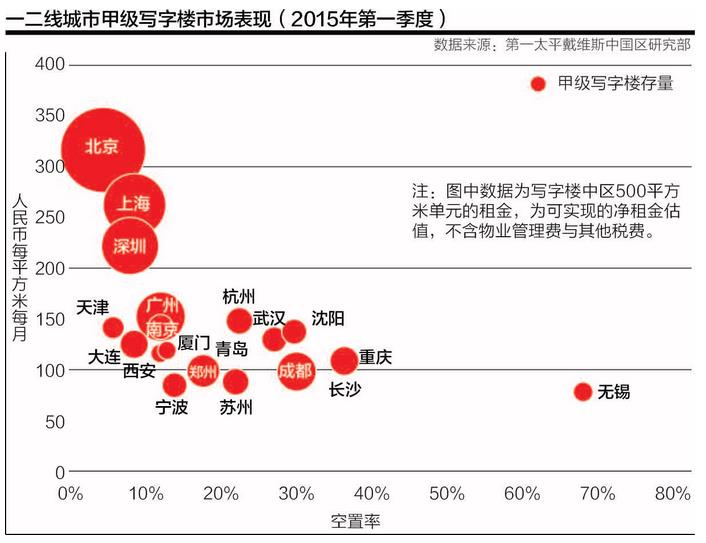 根据该机构的数据,全国主要城市中,北京、上海、深圳的甲级写字楼市场规模大,空置率都在10%以下。杭州、武汉、成都等地的甲级写字楼空置率均超过20%;沈阳、重庆、长沙都超过30%;无锡情况较严重,甲级写字楼市场的空置率超过了50%。