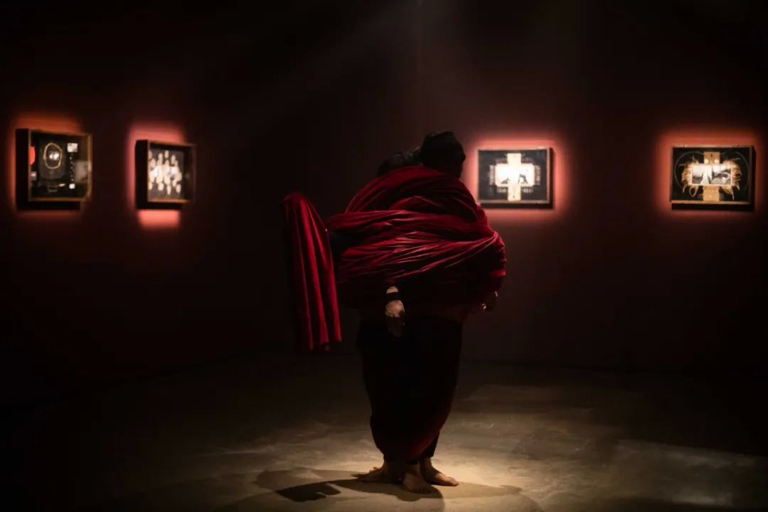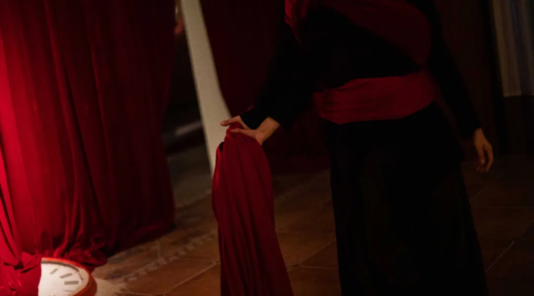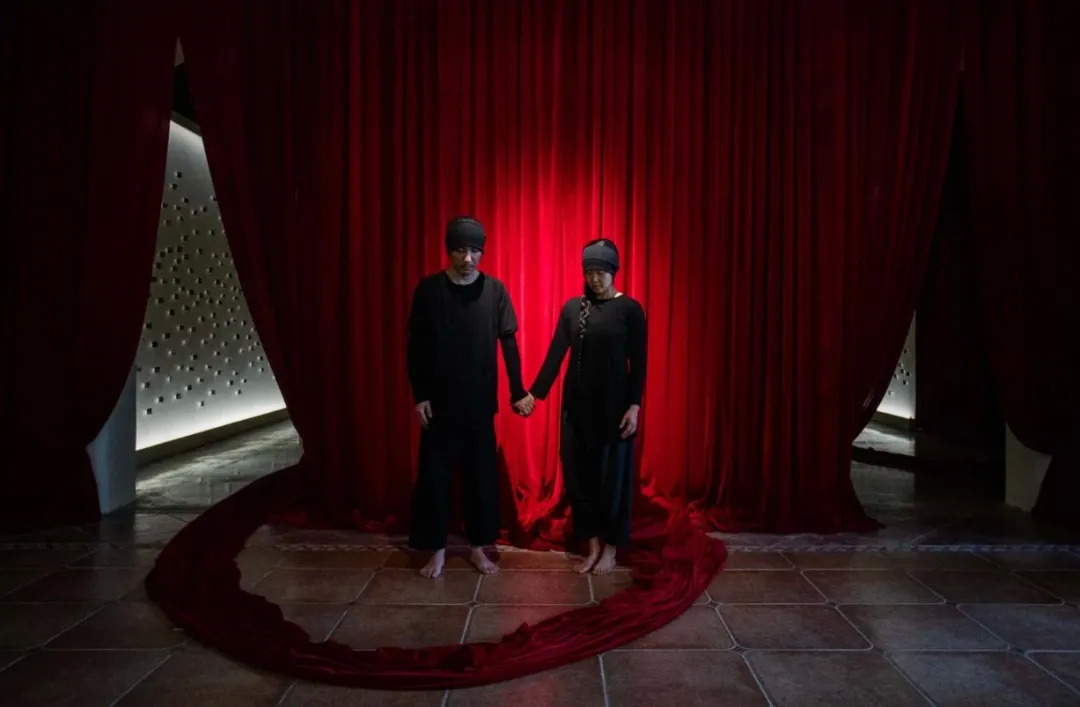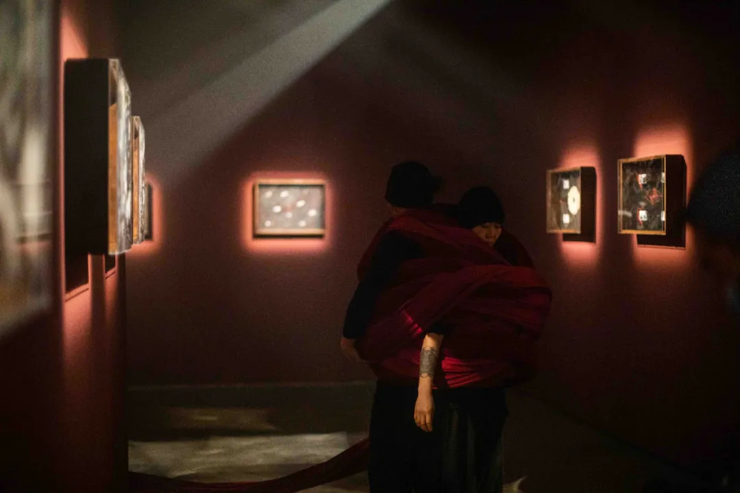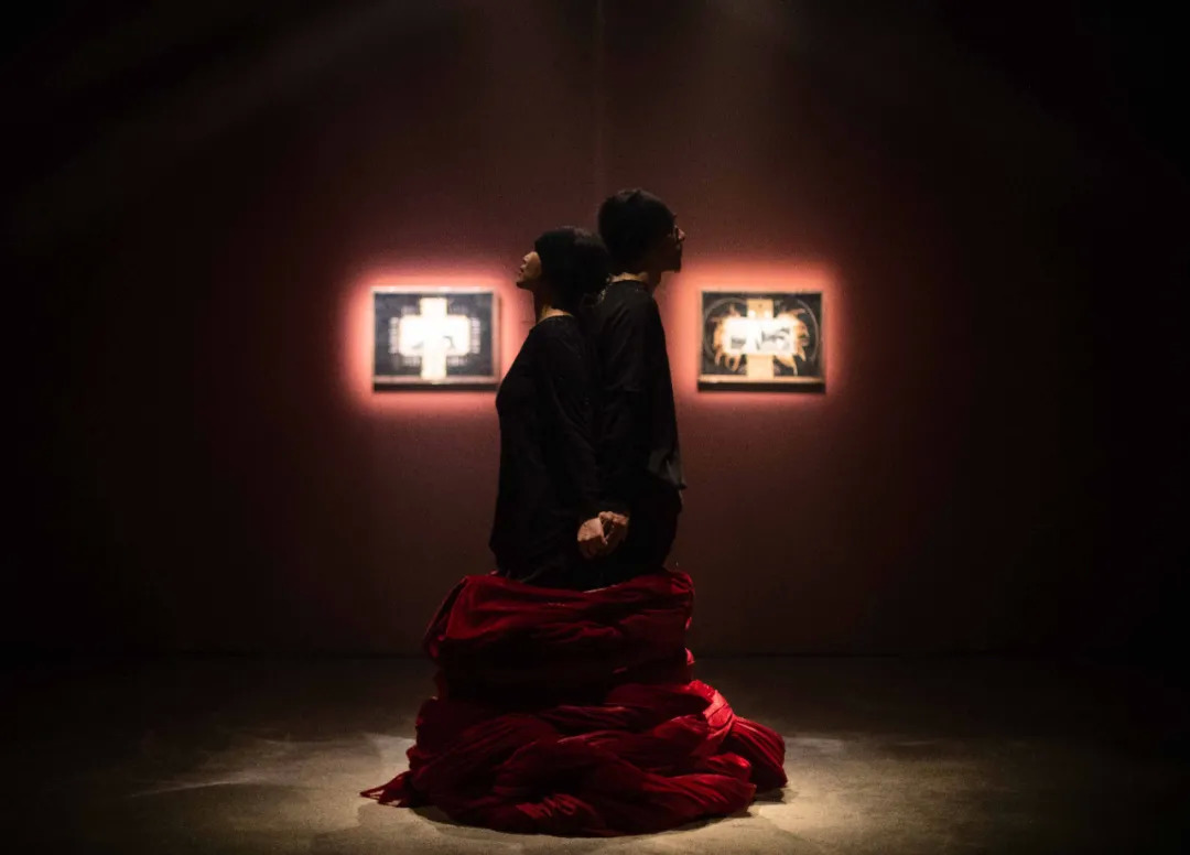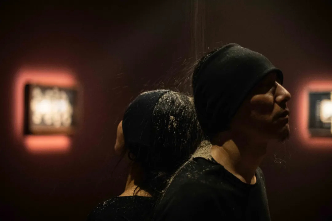 细沙从展厅上方落下,落在艺术家背靠背的缝隙中,落进了幕布的中心。幽暗的红墙展厅中,艺术家在光束中静立,只剩下细沙的流动与时钟的滴答声,尽管只是一小段时间,但时间却好像静止了,在顷刻间步入永恒。
