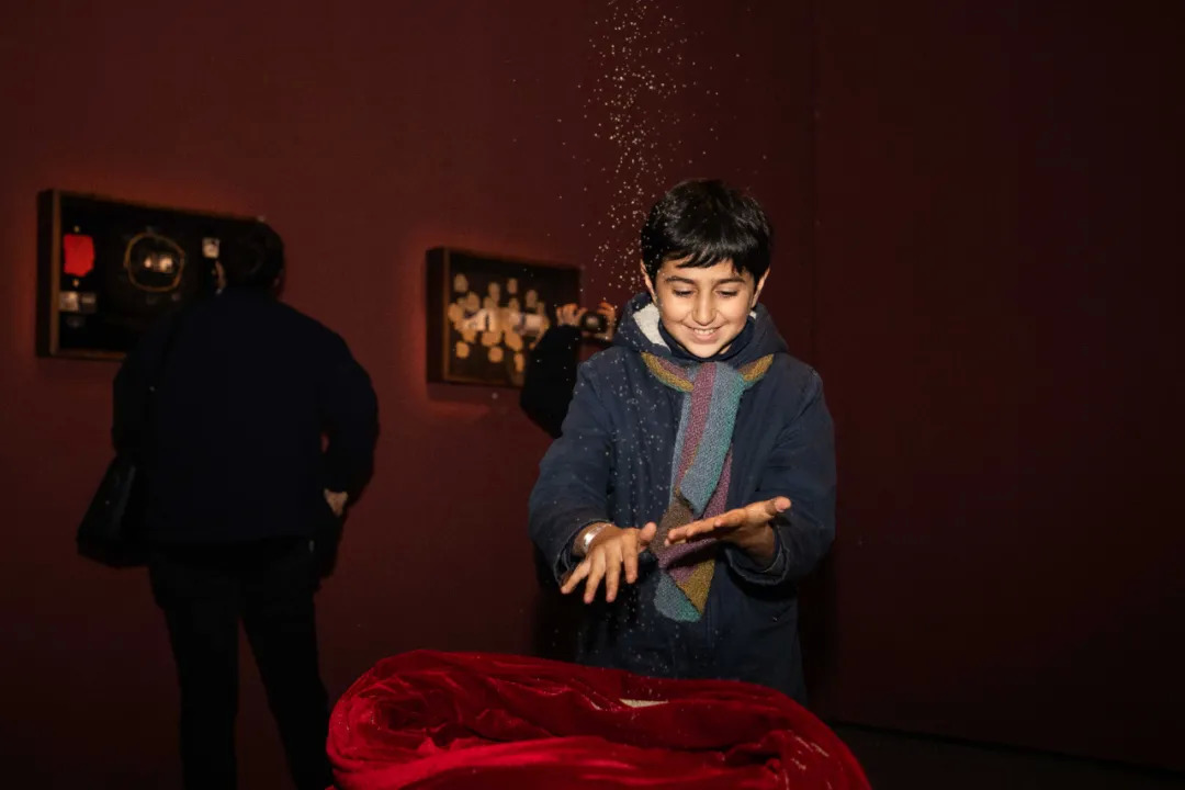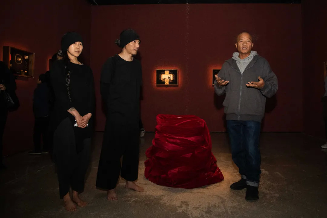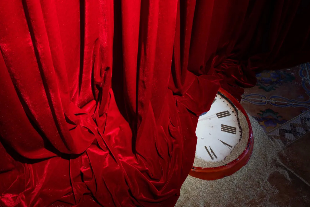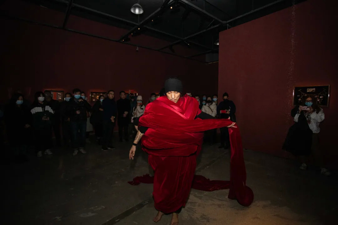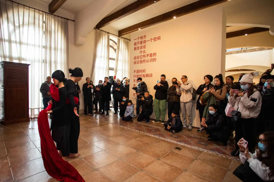 开幕当日,由主持人一首喃喃自语的诗歌独白——《无用的边界》,揭开了展览的面纱。随后,艺术家缓缓走上前来,在置有沙堆、时钟和红色幕布的展厅入口处,为大家开启一场关于时间、空间与关系的表演《庆祝生活的方法》。