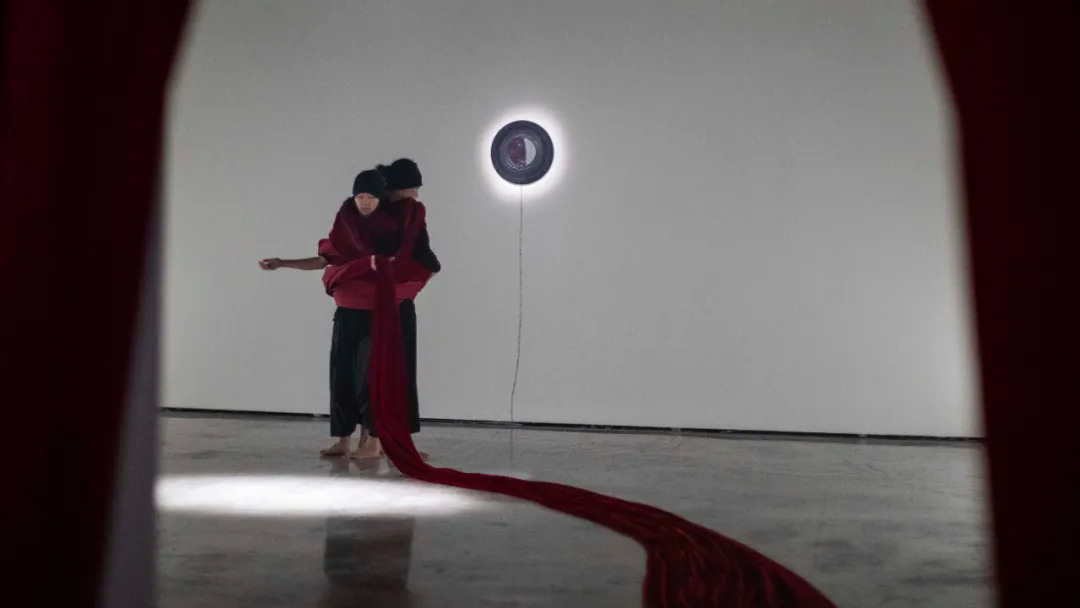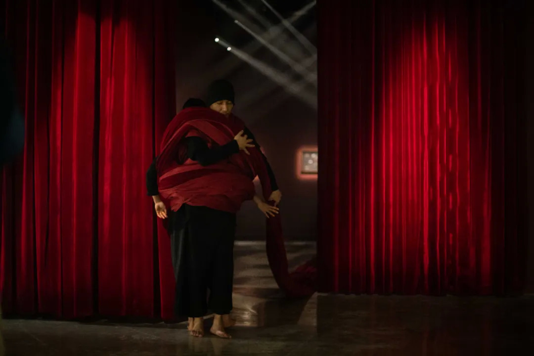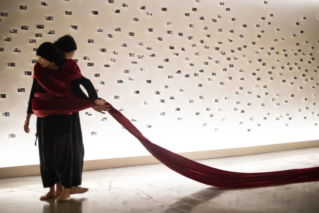 现场寂静无声,只有从展厅深处传来的时钟滴答声。艺术家背靠背,拿起地上延续进展厅的长条形幕布,不断转圈缠绕,将其作为联系彼此的纽带。跟着艺术家的表演轨迹,我们走进了展厅: