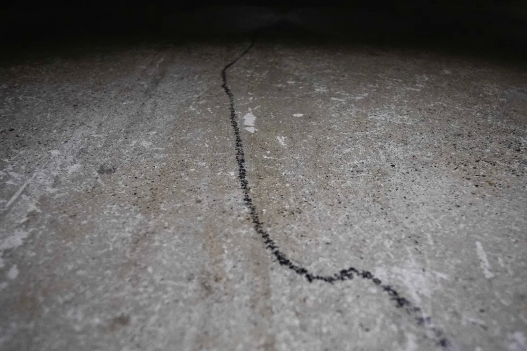 首先看到展厅中间的部分,这是艺术家根据展览空间创作的行为装置作品《连接处的光》。两面镜子相对悬挂在墙上,两人分别从悬挂镜子处的墙面开始对Break on through to the other side...JIM MORRISON的歌词进行解构书写,通过不断重复的书写来体验每一个当下,直到两人的书写行为和笔迹在展厅地面中间的一束光下连结。