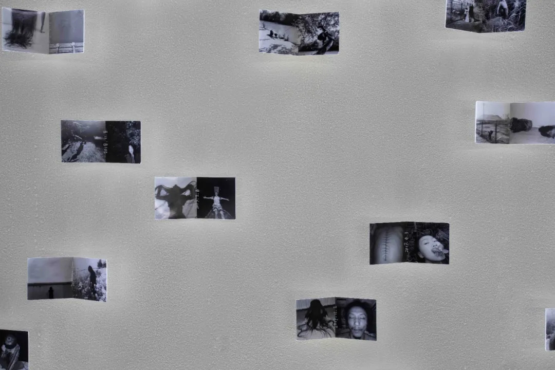 我们再把视线转移到展厅两旁,看到的是艺术家的《镜子》作品被无序、分散在墙面,这是刘珂和晃晃通过两年时间合作完成的作品。两年,730天,每一天相互为对方拍摄一张照片,拼接在一起并在中缝写上当天的日期,然后粘贴在光敏树脂3D打印的135度夹角基座上。