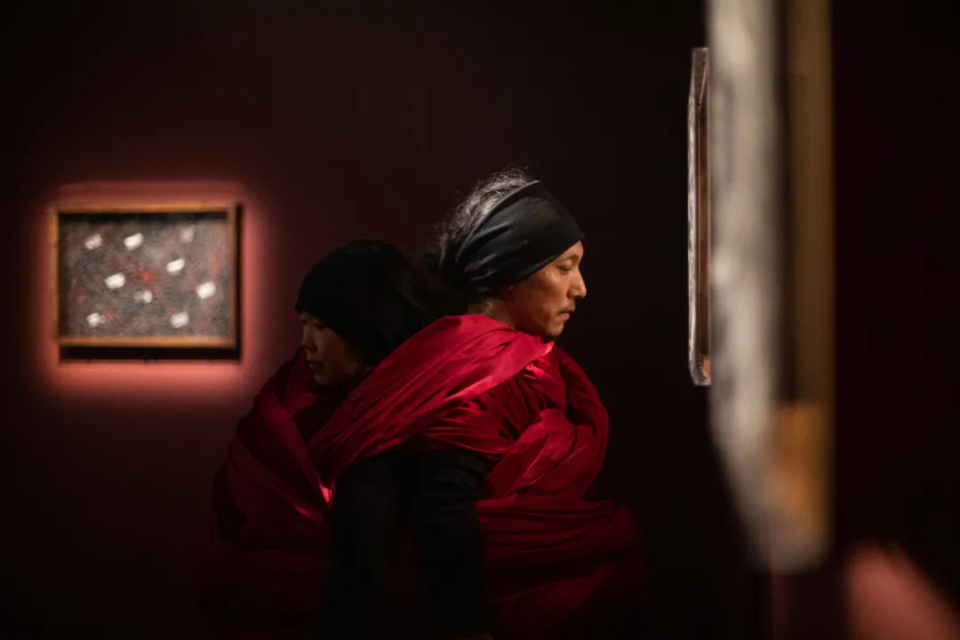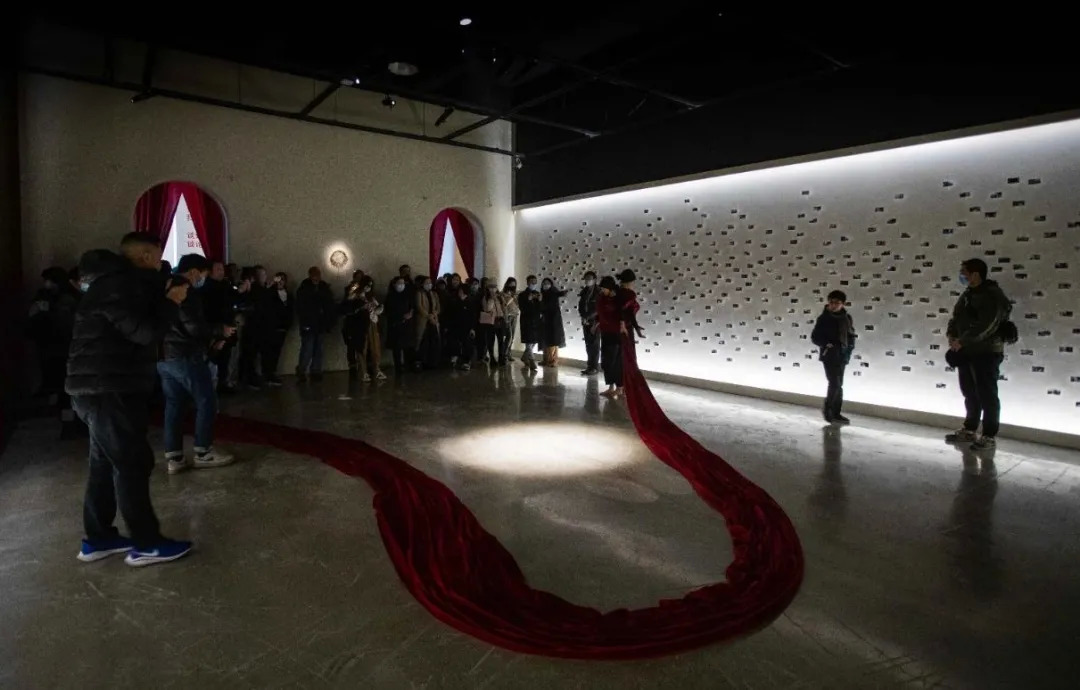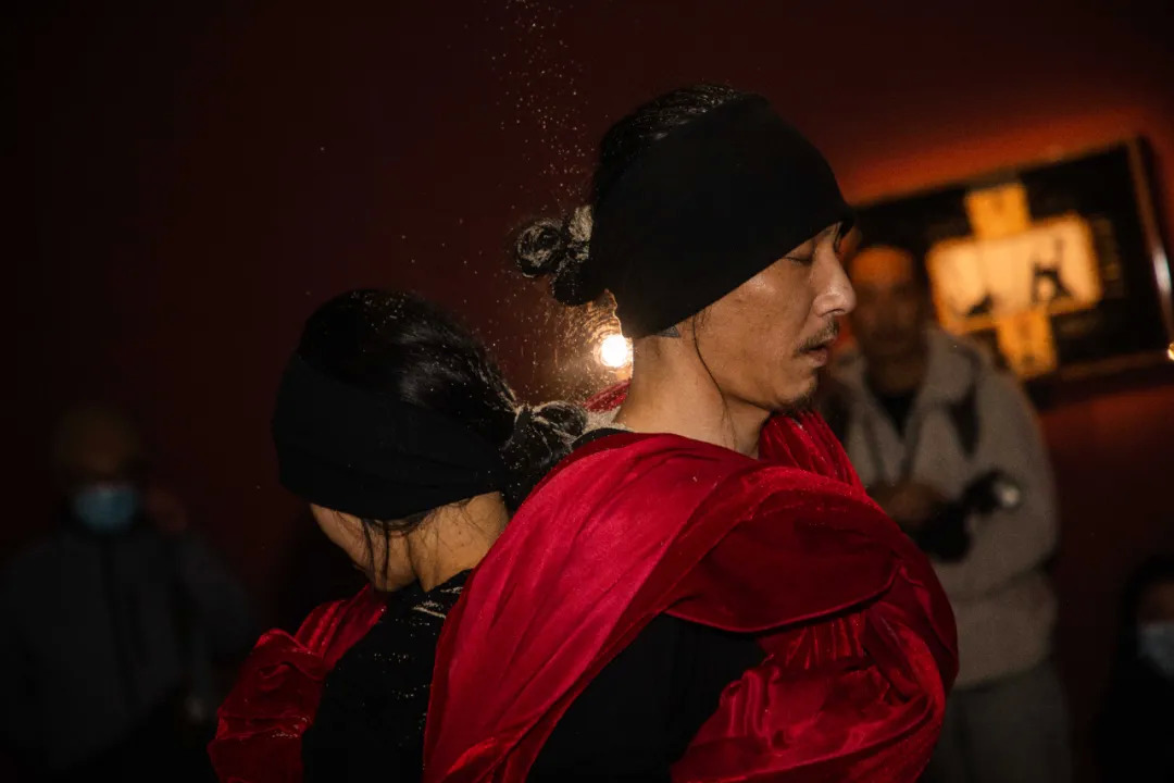 表演渐入尾声,艺术家身上的幕布越裹越大,越裹越紧,一开始轻盈的姿态也变得沉重缓慢起来,但他们相互支撑,依旧保持平稳的步伐。直到展厅最深处,观者才发现那股从表演一开始就配合着落下的细沙。