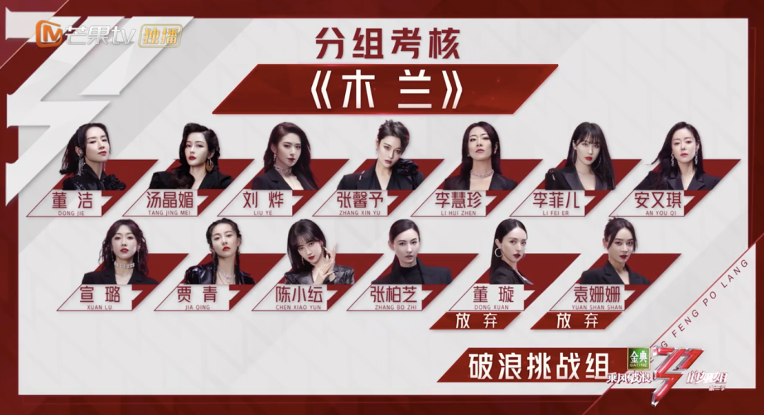 因为“破浪组”的姐姐们要“竞争上岗”,才能赢得自己心仪曲目的表演资格。“破浪组”将会被分为三个五人组,为了让挑战组能够组成最优组合,(也为了给姐姐们增加挑战难度),破浪组的成员可以学习不止一首歌曲。而三首曲目一公布,大家就准确辨识出了最有“逆风翻盘”潜质的歌曲《Mulan》。