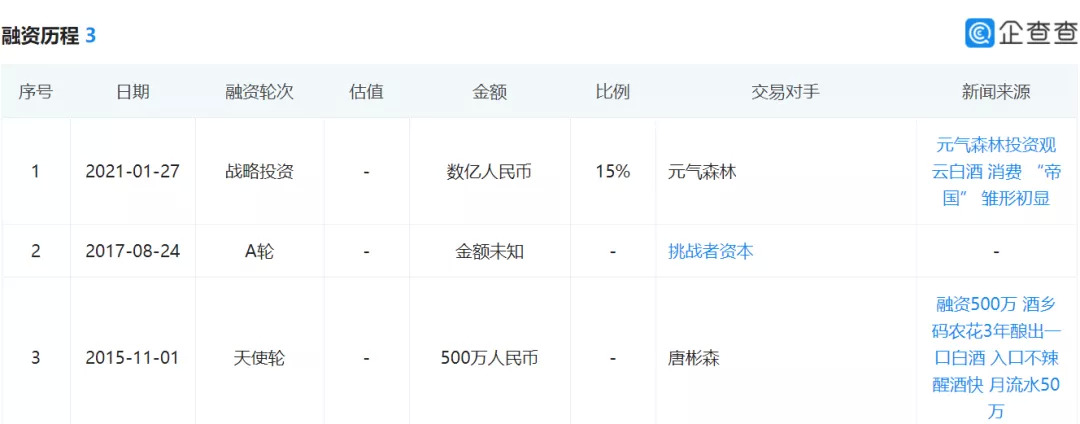 唐彬森对观云白酒的期待始于2014年。企查查显示,观云白酒成立至今获得的三次投资分别来自唐彬森、挑战者资本和元气森林——观云白酒自诞生起就是元气森林的饮品帝国中不可或缺的一部分。