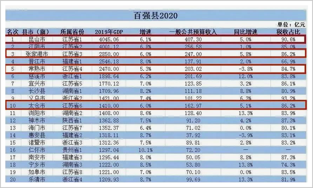 2020百强县前10名中,江苏省独占一半,并包揽前3位