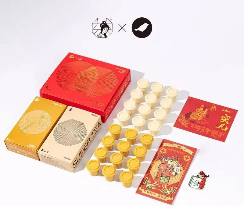 今年茶颜悦色联合咖啡品牌三顿半,推出茶咖礼盒,其中各含12枚茶颜悦色原液冷萃茶和三顿半超即溶咖啡,另外还有新年联名卡片、牛年刺绣贴、限定红包等,天猫旗舰店售价109元。
