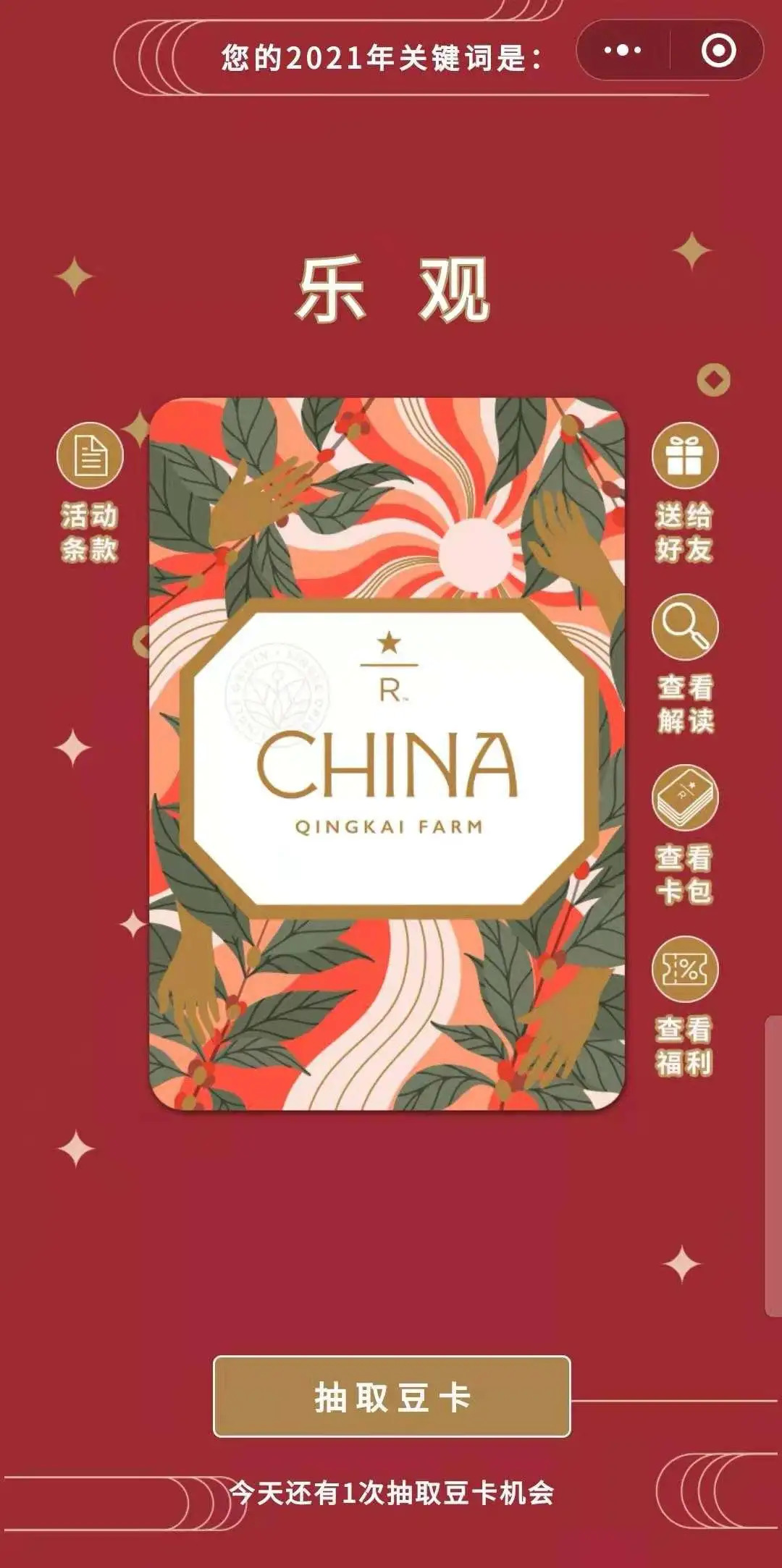 而星巴克通过微信小程序为过春节准备了“甄选咖啡上上签”,5种标签分别为:坚强签、创造签、乐观签、珍惜签、快乐签,每种标签对应一款咖啡豆,星迷们可以抽取豆卡,获得相应的饮品礼券。