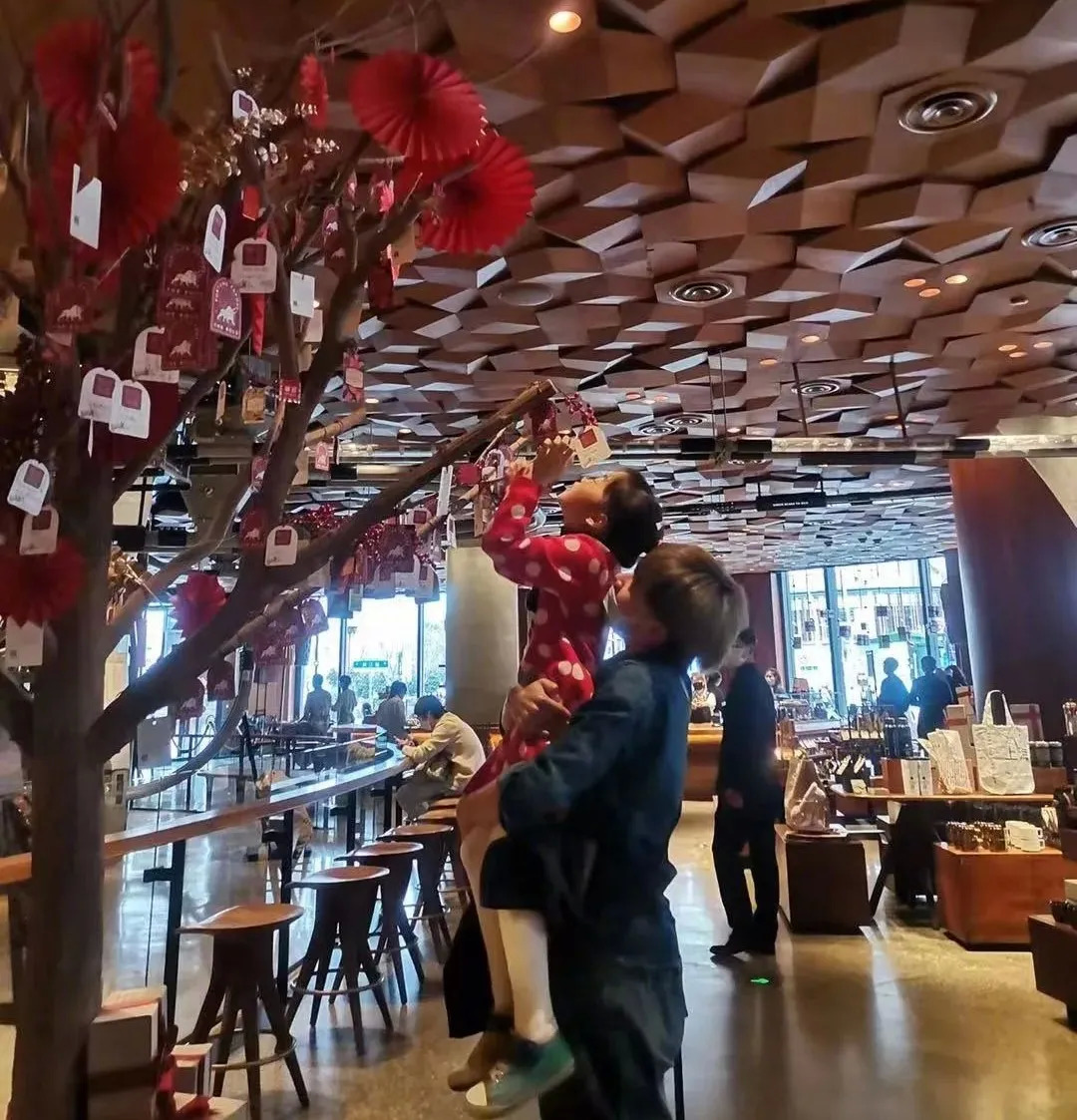 星巴克上海臻选烘焙工坊,放置了一颗“许愿树”,顾客可以在卡片上写下新年愿望并挂在树上,不仅让门店充满了浓浓的新年氛围,也让顾客有了参与感。