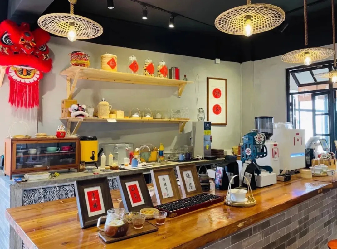 东莞的尚品咖啡,以中国风为主,临近过年咖啡馆装点了很多年味装饰,舞狮杂耍的狮子头、春联、中国书法等运用到门店的各个角落,甚至产品上,让每一个进入到咖啡馆的顾客都有种过年的氛围感。