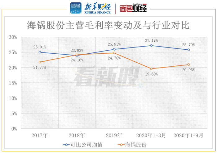图3:2017年至2020年9月海锅股份主营毛利率与行业对比