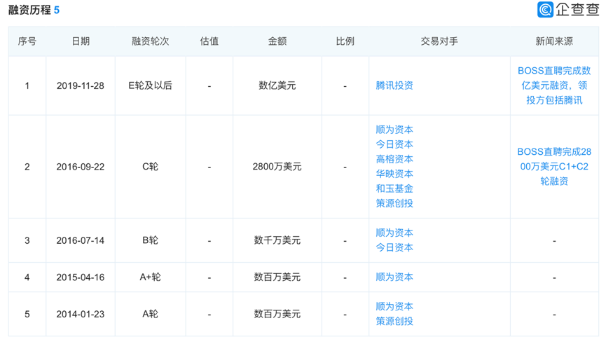 BOSS直聘的融资历程被外界认为是“小步快走”节奏,不到半年融一小轮,目前已完成5轮融资,投资方包括策源创投、顺为资本、今日资本等。2019年末,BOSS直聘完成数亿美元融资,由腾讯领投,投后占股接近10%。