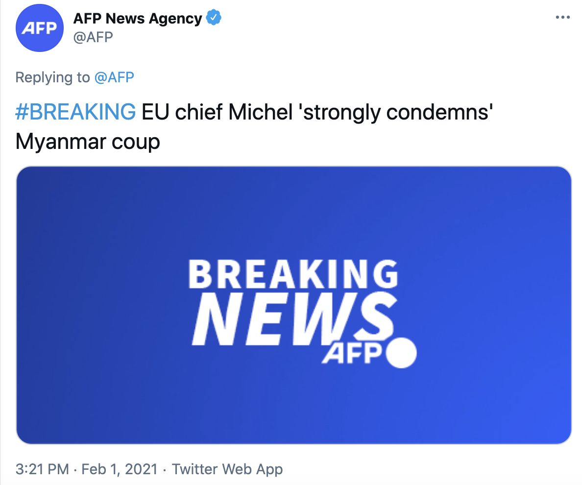 法新社2月1日消息,欧洲理事会主席米歇尔“强烈谴责”缅甸政变。