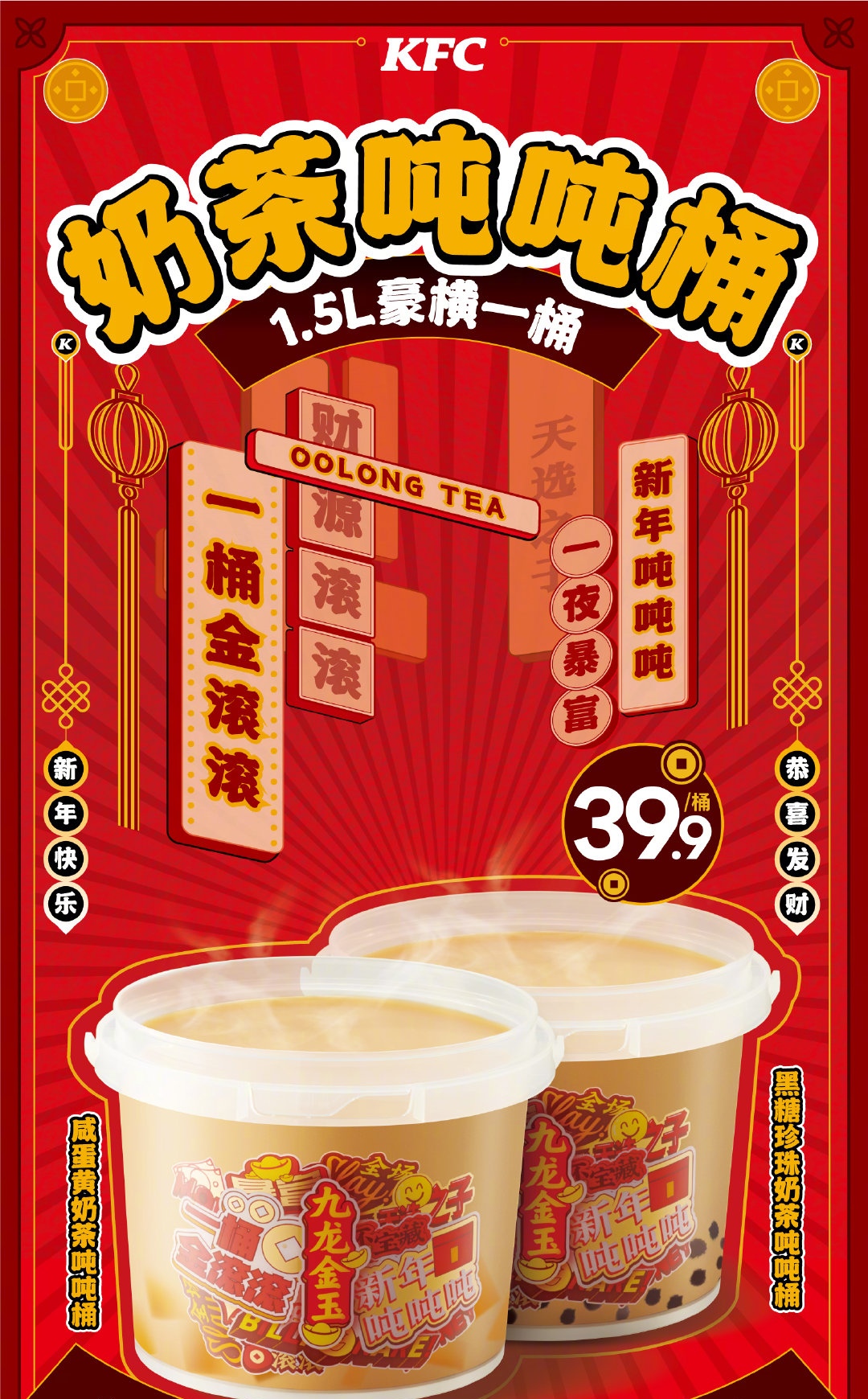 不过要一个人干完一整桶还是比较困难,吨吨桶配了两个吸管口,满足多人分享奶茶的快乐。肯德基奶茶吨吨桶现已正式上市,每桶售价39.9元,共限量8万桶,且仅部分地区有售。
