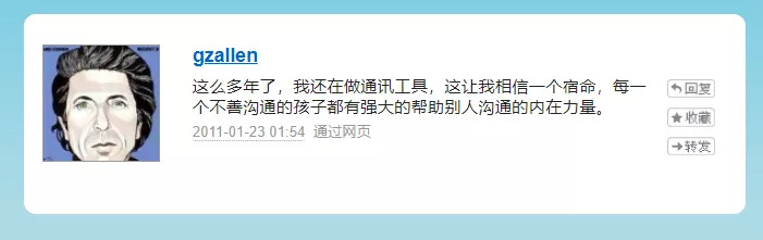 张小龙曾在饭否上写下:这么多年了,我还在做通讯工具。这让我相信一个宿命,每一个不善沟通的孩子都有强大的帮助别人沟通的内在力量。