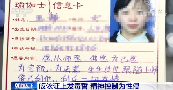 为了控制弟子,王兴夫要求每个弟子在皈依和修炼的时候,必须在制式的“皈依证”“瑜伽信息卡”上亲笔写下毒誓,如果叛师叛道,甘受五雷轰顶、被蛇咬死、窒息、被车撞死,并且是现世报。