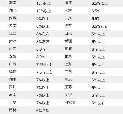 近年来经济增长处于全国领先地位的中西部省份也给出了较高的增速预期。例如,西藏将今年经济增长目标设定在9%以上,云南为8%以上,贵州和江西在8%左右,安徽和山西定在8%。