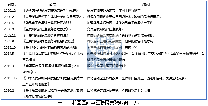 根据(表一:我国医药与互联网关联政策一览)来看,从上个世纪末我国政府所颁布的《处方药与非处方药流通管理暂行规定》可以得知我国医药电商的发展受到政府的管控是如此的严苛。在过去将近15年发展的历程中,国家对医药在互联网上销售管控主要分为三类:网上进行医药流通企业的资质要求,处方药和非处方药的网络销售,第三方物流是否参与药品流通环节等。