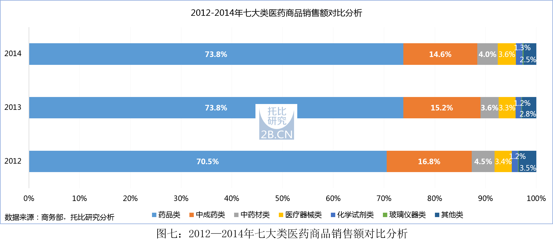 按照惯例,医药产品可以分为七大类型,分别是药品类、中成药类、中药材类、医药器械类、化学试剂类、玻璃仪器类、其他类。根据商务部公布2012-2014年各类医药产品的销售额数据得知,药品类始终占据最主要的销售份额,三年的比重均在70%以上,其次是中成药类,一直在15%左右,排在第三的是中药材类销售比重在4%左右,中成药类和中药材类可以合并成中药类,三年的销售比重在20%左右,排在第四的是医疗器械类,销售占比3%左右。尽管2012年到2014年每一年的七大类医药商品销售额比重都在变化,但是整体的销售占比基本上保持了相对稳定的状态,不难得出药品类、中成药类、中药材类、医疗器械类占据主要销售份额的结论。