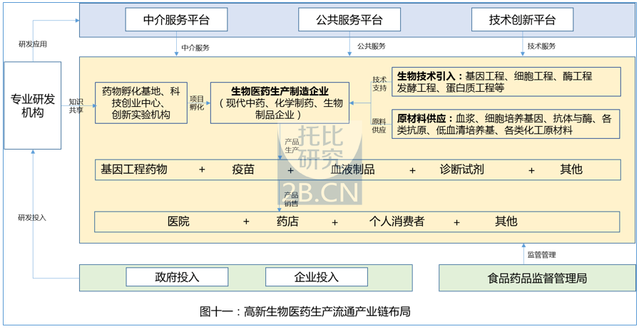 高新生物医药产业的发起端一定是专业的研发机构,而这些研发除了企业进行投入,更多的还是要依靠政府主导进行专项扶植,并在中介服务平台、公共服务平台、技术创新平台的共同努力下,将技术转化成产品并实现消费。专业研发机构的产品进行知识传递或知识共享到药物孵化基地、科技创业中心、创新实验机构,大多以项目的方式流转到生物医药生产制造企业,包括现代中药企业、化学制药企业、生物制品企业等,企业依托基因工程、细胞工程、酶工程、发酵工程、蛋白质工程等高新技术,在血浆、细胞培养基因、抗体与酶、各类抗原、低血清培养基、各类化工原材料企业供应下投入生产,生产的产品主要包含四大类,基因工程药物、疫苗、血液制品、诊断试剂,产品成产完结后最终走向销售和消费端。