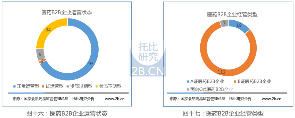 目前从事医药B2B电商业务的企业共有138家,其中A证企业25家,B证企业113家。从企业网站的运营角度来看,有93家网站处于正常运营的状态,可以实现B2B贸易服务,其中A证企业21家,B证企业72家;有2家B2B企业是2015年刚刚上线,处于试运营阶段,A证企业、B证企业各一家;同时托比研究在对这些有资质进行B2B贸易医药电商梳理分析的过程中发现有9家拥有B证的企业资格证已经过期,目前处于暂停运营的状态;有34家企业运营状态不明确,其中目前未展开B2B业务的3家,没有找到相关网站的企业共有35家。另一方面,托比研究发现,部分拥有开展B2B业务的企业开通了向C端销售的业务,这样的企业共有7家,专门搭建第三方交易平台提供B2B服务的企业19家,从事与其他企业医药交易的B2B电商共有112家。