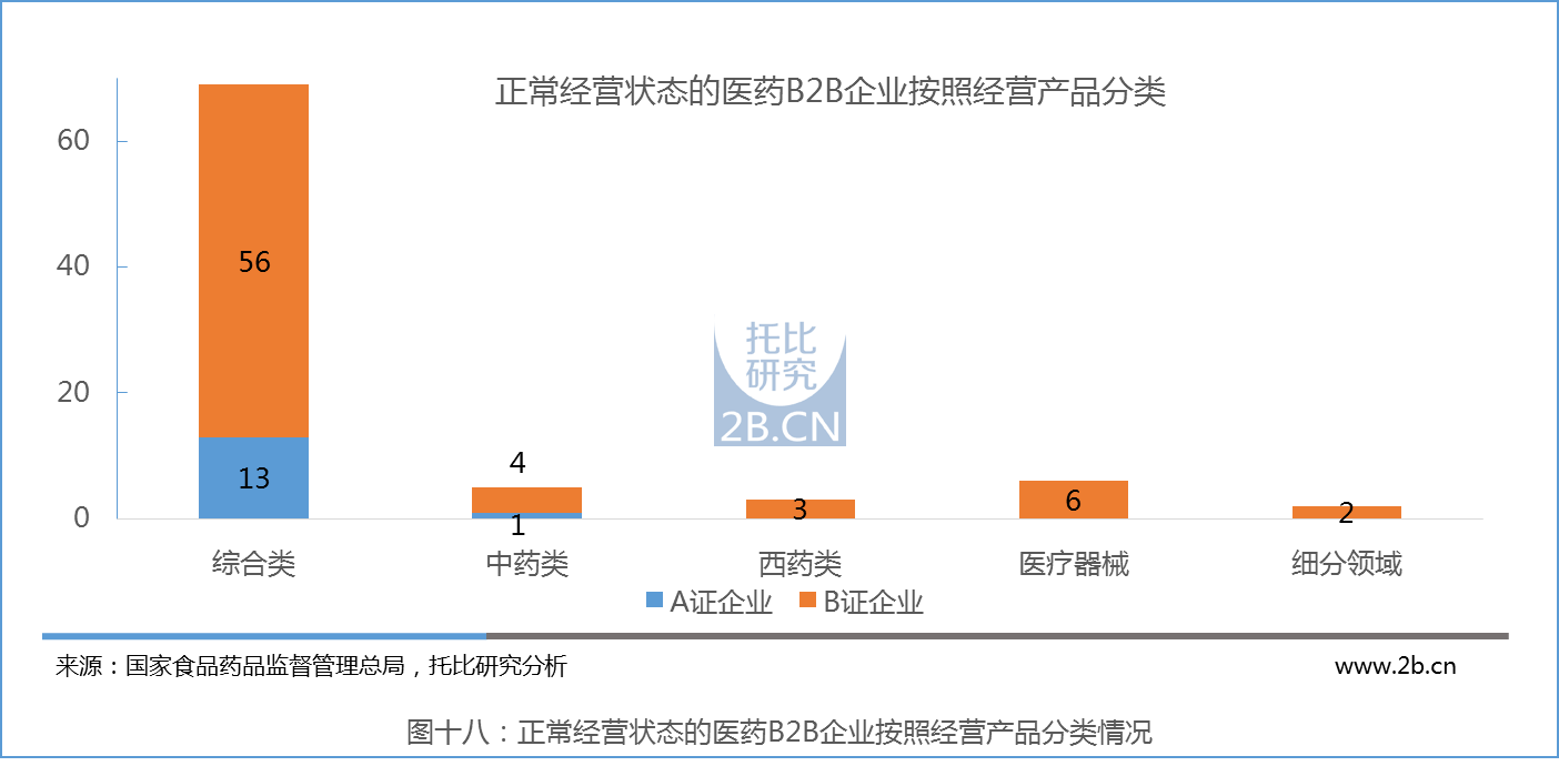 医药行业的产品丰富,从事B2B领域的企业所覆盖的产品基本上是全品类的,从事综合类医药产品的B2B企业共有69家,其中拥有A证的企业13家,拥有B证的企业有56家;从事中药B2B的企业共有5家,其中拥有A证的企业1家,拥有B证的企业有4家;从事西药、医疗器械以及细分领域的医药B2B企业分别有3家、6家和2家,并且都是拥有B证的企业。值得说明的是,从事细分领域的B2B企业均是围绕着牙齿护理提供相关产品和服务。