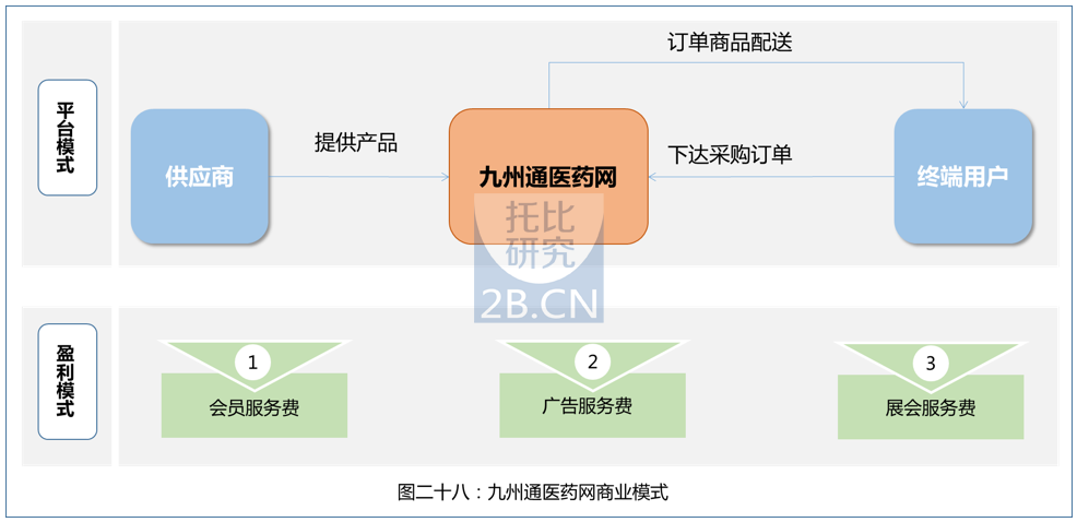 在商业模式的运作上,为买卖双方提供了交易撮合的平台,建立在全国各地省市布局的九州通子公司销售平台。它的盈利模式主要通过收取会员的服务费用、广告费用、展会费用来完成。