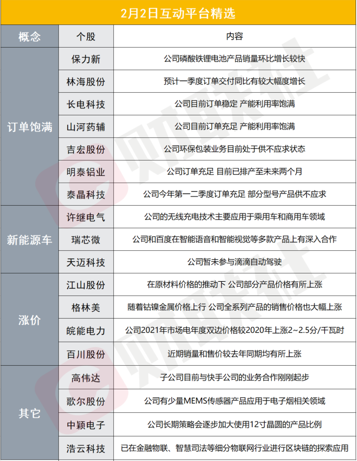 今日指数震荡走高,市场分化明显,注册制新股遭资金兑现,资金回流锂电、光伏、军工等板块,汽车整车板块大幅走强。互动平台上订单饱满、涨价、新能源车受关注。林海股份表示预计一季度订单交付同比有较大幅度增长;山河药铺表示公司目前订单充足,产能利用率饱满;吉宏股份表示公司环保包装业务目前处于供不应求状态;泰晶科技表示公司今年第一二季度订单充足,部分型号产品供不应求;许继电气表示公司的无线充电技术主要应用于乘用车和商用车领域;高伟达表示子公司目前与快手公司的业务合作刚刚起步;歌尔股份表示公司有少量MEMS传感器产品应用于电子烟相关领域。