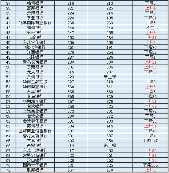其中重庆银行从去年的259位,上升至今年206位,排名上升了53位,成为71家中国银行机构中排名上升速度第二的银行机构。