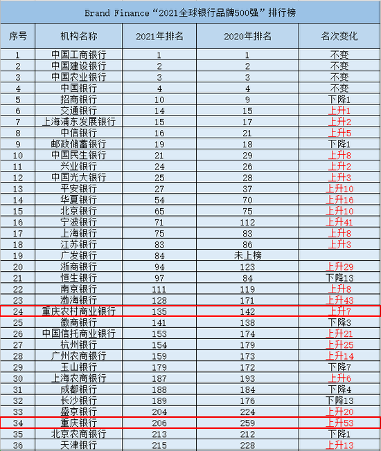 2月1日,Brand Finance“2021全球银行品牌500强”排行榜公布,中国有71家银行机构上榜。重庆有两家银行机构名列其中,并且排名较去年都有所上升。其中,重庆农村商业银行排名上升7位,重庆银行排名上升了53位,上升速度在71家银行中排名第二。