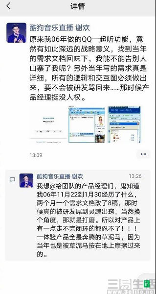 对于网易云音乐的这番指控,疑似酷狗音乐副总裁谢欢在朋友圈做出回应称,“原来我06年做的QQ一起听功能,竟然有如此深远的战略意义,找到当年的需求文档回味下,我能不能告别人山寨了我呢? 另外当年写的需求真是详细,所有的逻辑和交互图必须做出来,要不会被研发骂回来......那时候产品经理挺没人权。”