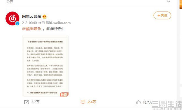 在拼多多逐渐从舆论风口逐渐隐身后,互联网圈的吃瓜群众一下子就变得无所事事了,不过在刚刚闲了一段时间后,吃瓜群众似乎又有好戏看了。2月2日网易云音乐通过微博喊话酷狗音乐,并称“狗年快乐”,但明明今年是辛丑牛年,因此显然这是在阴阳怪气了。