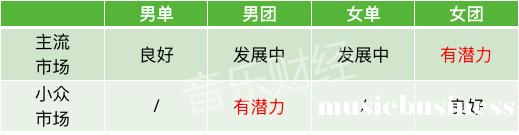 不过关于团体市场的多样化,确实是需要思考的问题。目前男子单人偶像和女子团体在主流市场和小众市场各自发展良好,而男团和女子单人偶像则在主流市场缺少后劲,这是在造星水平提升后,就能够发展的两个部分。
